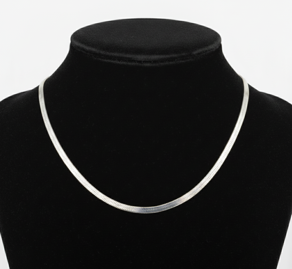 The Flux necklace brings fluid precision to the neckline with its smooth, continuous curve and fine textured finish. Its polished surface reflects light with quiet clarity, creating a piece that feels both minimal and intentional.